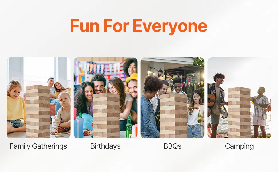 Ideal for Multiple Settings: This tumbling tower game is ideal for both indoor and outdoor use, including backyards, lawns, beaches, and more! It is great for family gatherings, birthday parties, BBQs, picnics, camping, and even solo play!