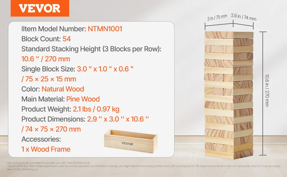 The tumble timber set includes 54 blocks, each measuring 3.0" x 1.0" x 0.6" . Customize your own game by writing rules on the blank blocks, or use them for decorative purposes. The tower can reach up to 2 feet for an exciting challenge!