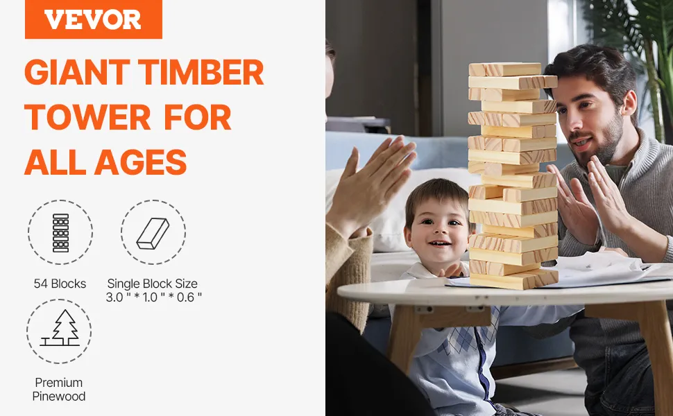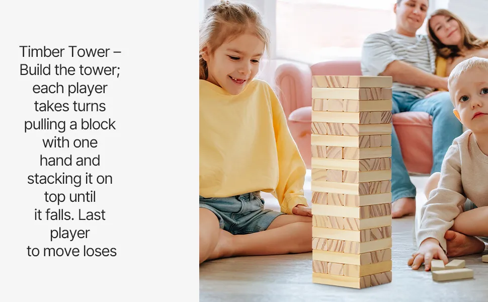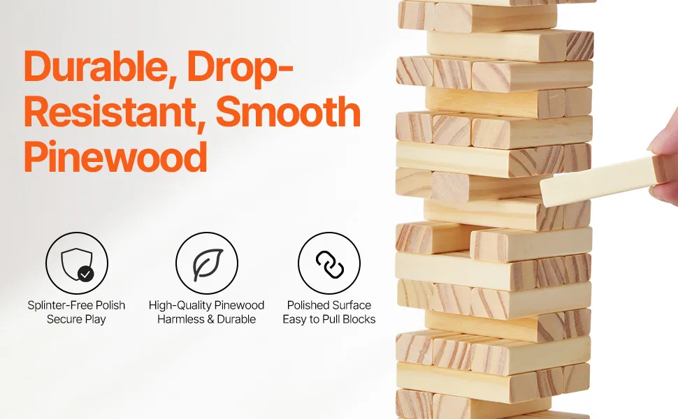 Premium Pinewood: Crafted from high-quality pine wood, this tumble tower blocks game is durable and built to withstand heavy play. Each block is precisely cut, smooth, splinter-free, and crack-free, making it easy to remove blocks during the game.