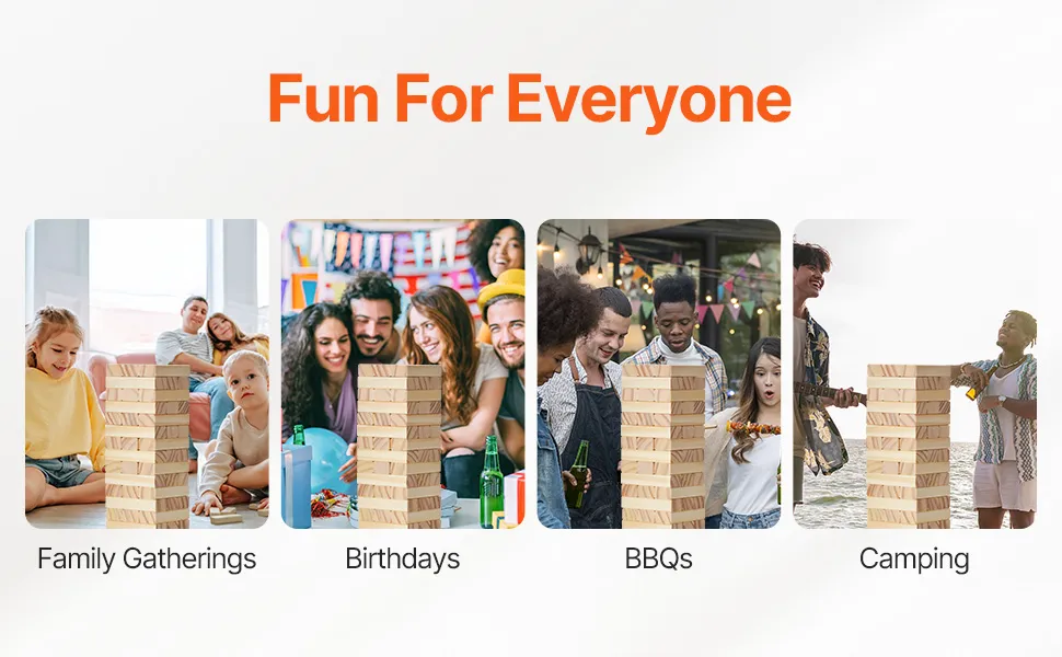 Ideal for Multiple Settings: This tumbling tower game is ideal for both indoor and outdoor use, including backyards, lawns, beaches, and more! It is great for family gatherings, birthday parties, BBQs, picnics, camping, and even solo play!