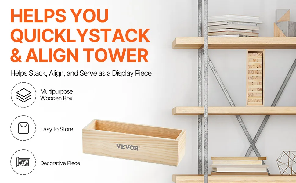 The wooden box helps you quickly stack and straighten the tower. It also doubles as a storage box or decorative display.