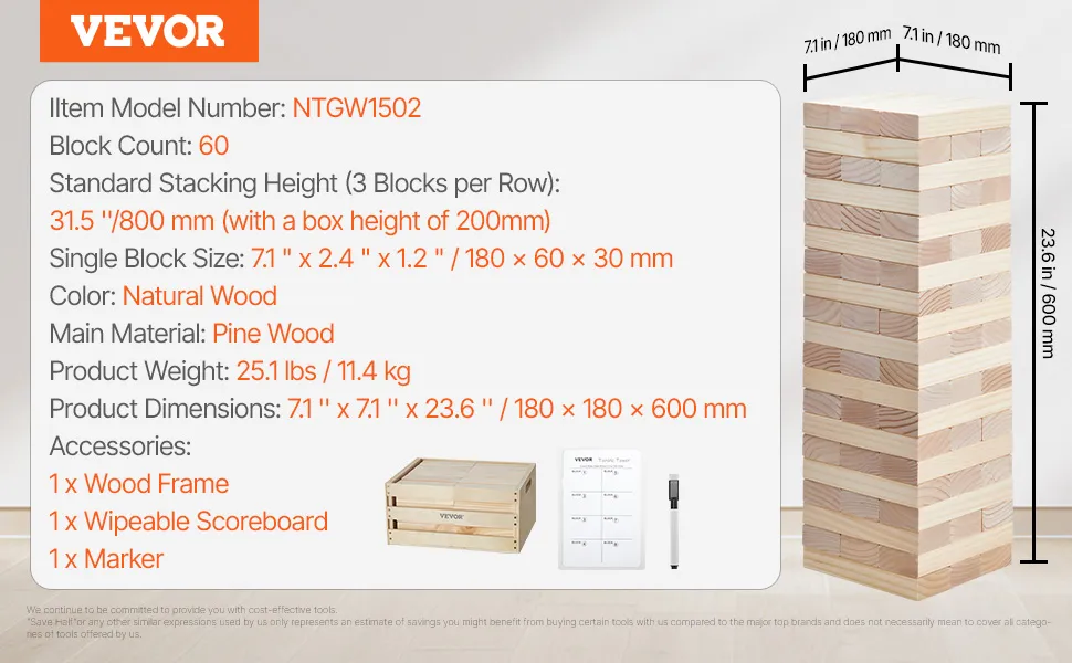 The tumble timber set includes 60 blocks, each measuring 7.1" x 2.4" x 1.2". Customize your own game by writing rules on the blank blocks, or use them for decorative purposes. The tower can reach up to 5.5 feet for an exciting challenge!