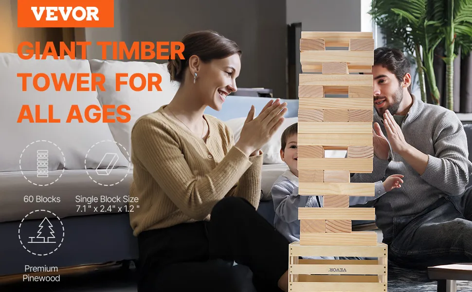VEVOR Tumbling Timber Toy, 60 Blocks Giant Tumble Tower Blocks Game, Pine Wood Tumbling Tower Game with Storage Crate and Scoreboard, Wooden Stacking Game, Tumble Tower Family Games for Indoor/Outdoor