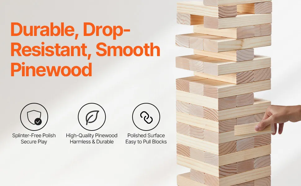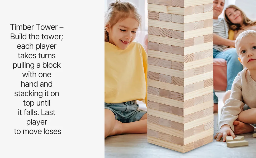 Premium Pinewood: Crafted from high-quality pine wood, this tumble tower blocks game is durable and built to withstand heavy play. Each block is precisely cut, smooth, splinter-free, and crack-free, making it easy to remove blocks during the game.