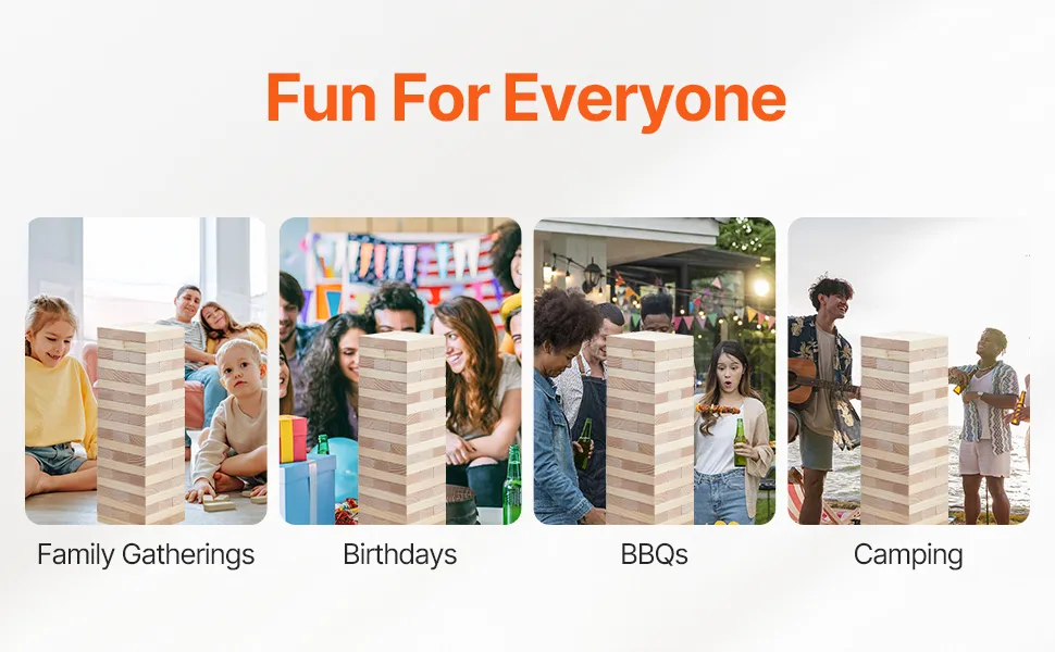 Ideal for Multiple Settings: This tumbling tower game is ideal for both indoor and outdoor use, including backyards, lawns, beaches, and more! It is great for family gatherings, birthday parties, BBQs, picnics, camping, and even solo play!