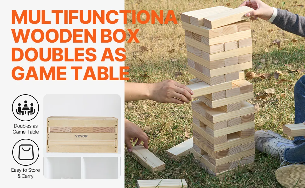 The versatile wooden box of the tumble tower can be used as a game table, raising the tower for easier block extraction. It also helps avoid bending over while playing on the floor, adding convenience and comfort to your game experience.