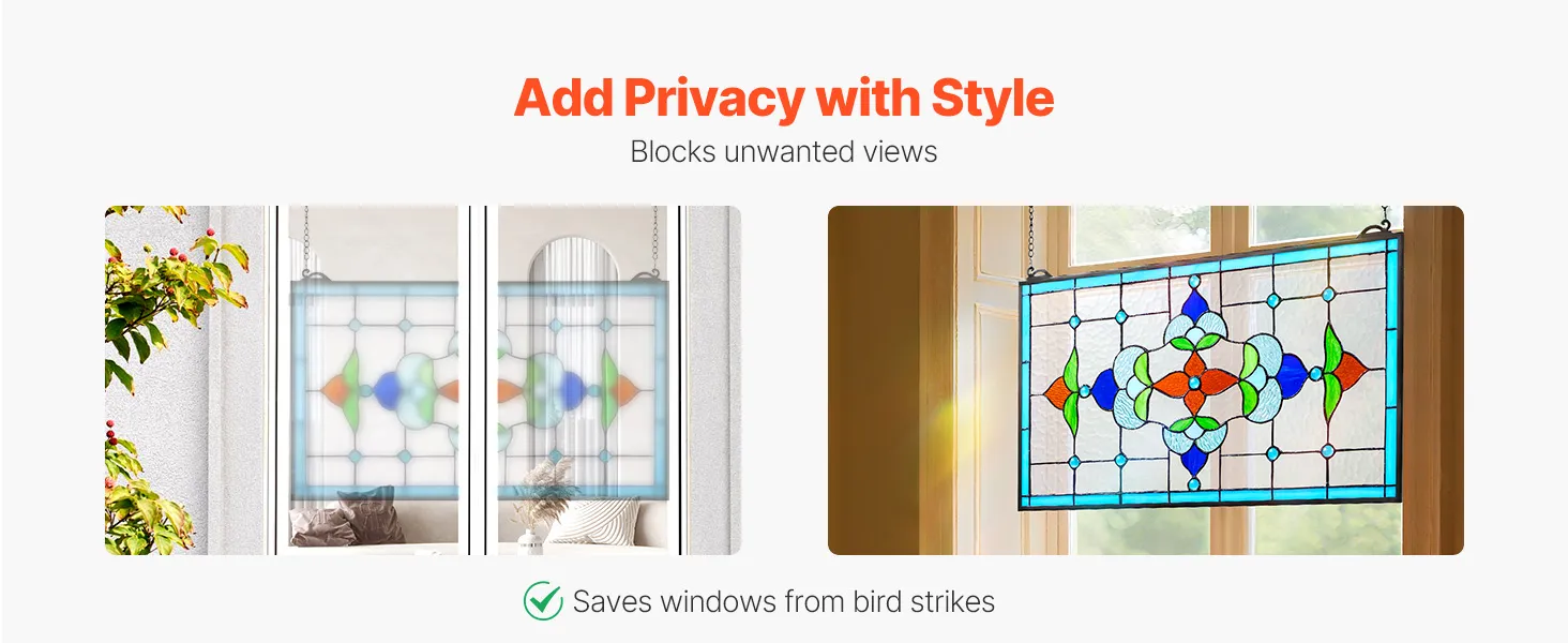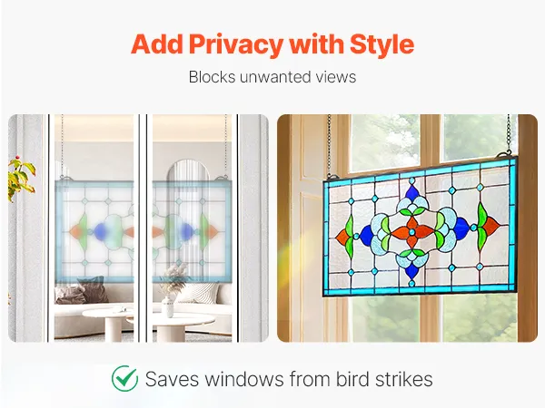Designed to obscure outside views, this hanging stained glass panel keeps your room bright while blocking prying eyes—ideal for windows facing streets or neighbors. It also helps avoid bird collisions, acting as a gentle security layer.