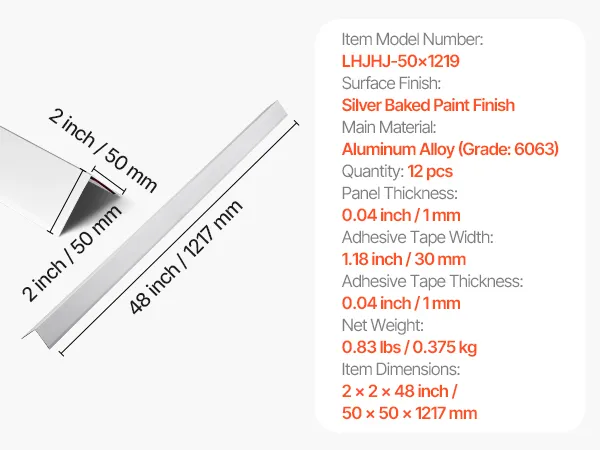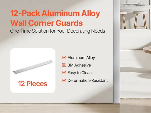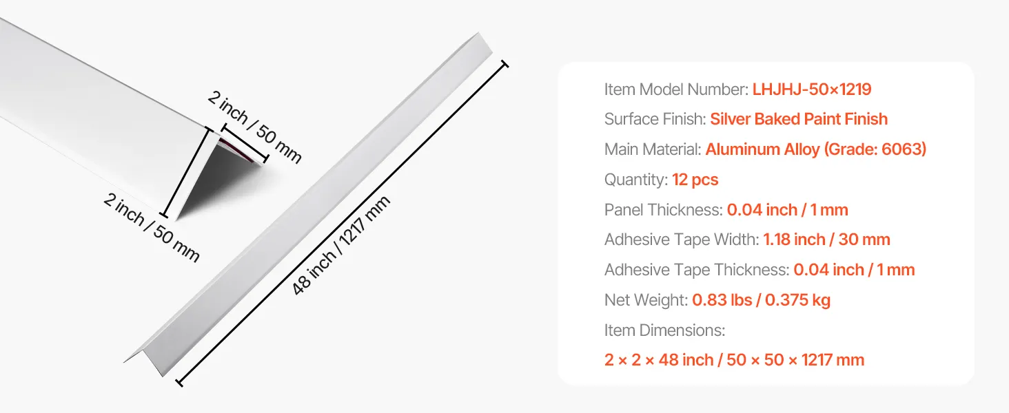 VEVOR Alluminum Alloy Wall Corner Protector, 50 x 50 x 1217 mm, 12 Pack Metal Corner Guards, Edge Trim Protector 90-Degree Angle L Shape for Home,Office,Commercial Wall Protection, with 3m Tape