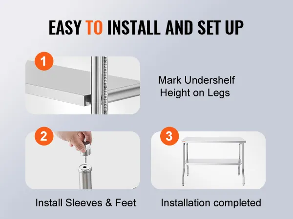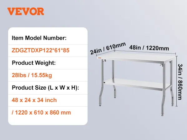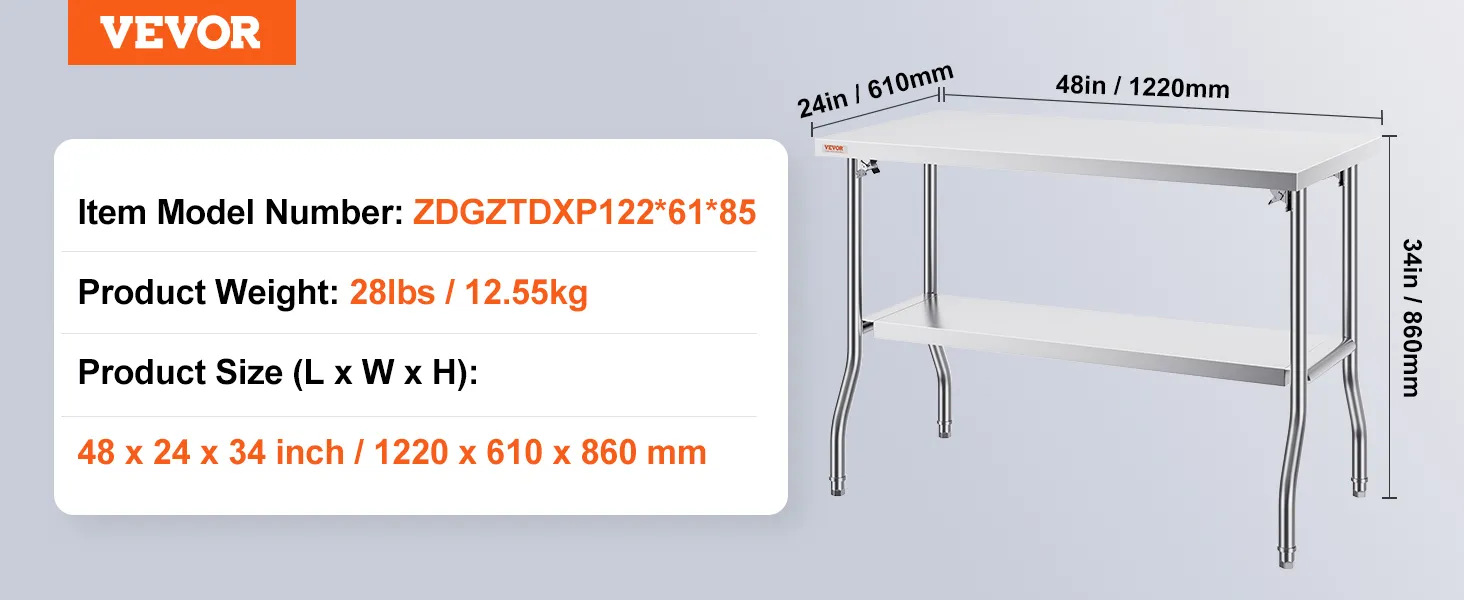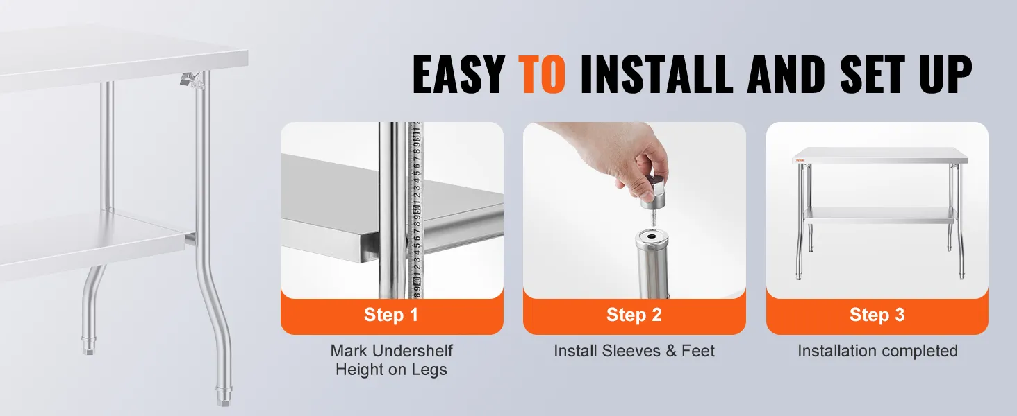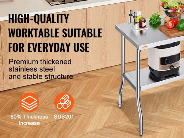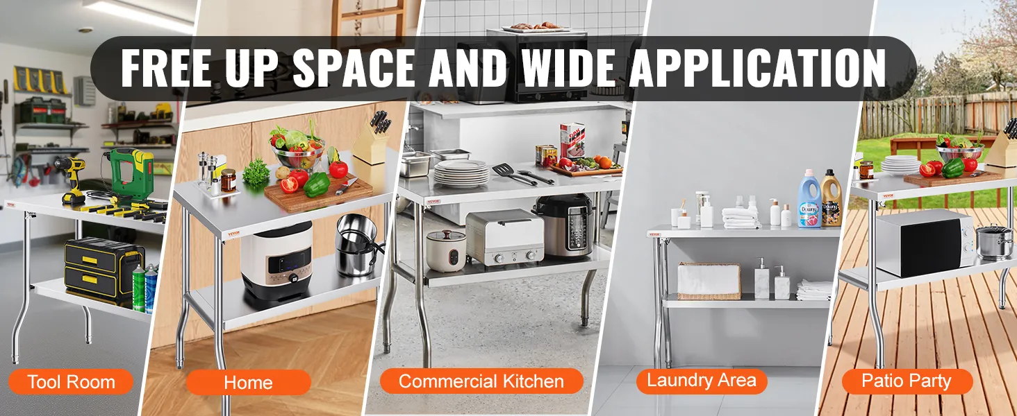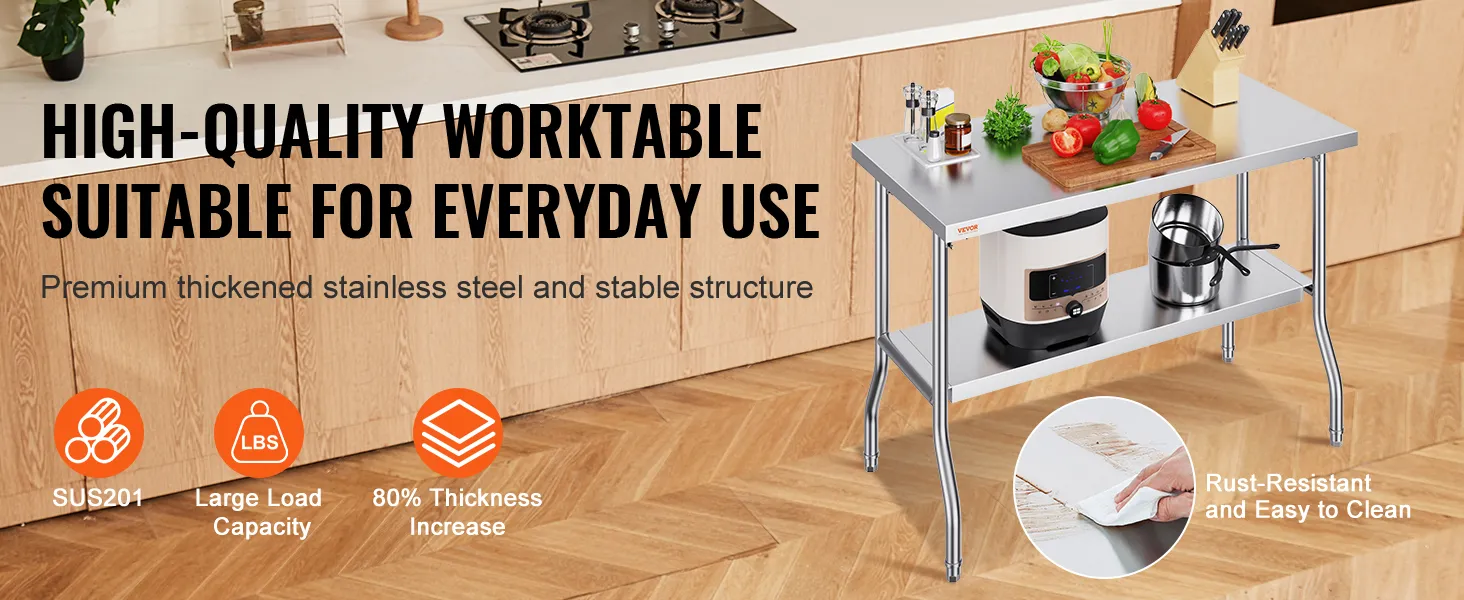 It's built to last. It is a heavy-duty stainless steel table. With a load capacity of 772 lbs, it can handle substantial weight. The sturdy design ensures it stays stable under heavy loads. It is ideal for holding heavy kitchen appliances or workshop tools. You can use the table effectively without wobbling. A strong structure supports hard workouts without worrying. It assists in demanding tasks without worrying about scratches and impacts while maintaining its appearance over time. This worktable can withstand the rigors of commercial and home environments. This durable finish resists scratches as well as impacts. It maintains its looks over the years. We design it to withstand challenging circumstances and the most demanding tasks. Therefore, this table provides a reliable solution for even the most demanding tasks. You can trust it to perform reliably in different settings.