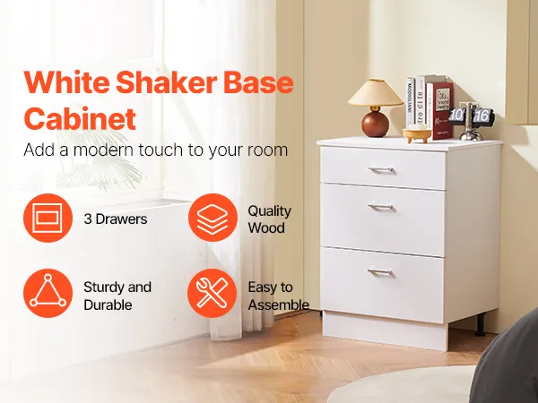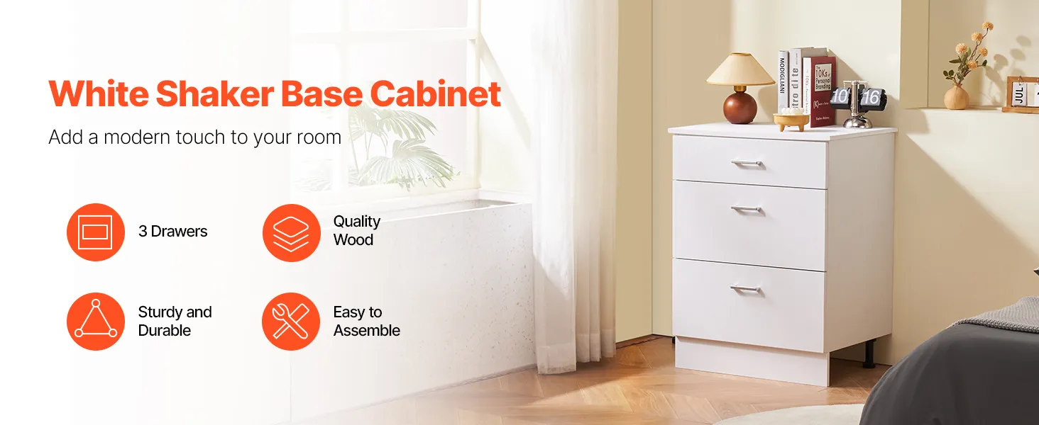 VEVOR White Shaker Base Cabinet with 3 Drawers, 24-Inch Unassembled Drawer Base Cabinet, 24" W x 19" D x 32" H Ready to Assemble Cabinet with Soft-Close Drawer Slides, for Home Office