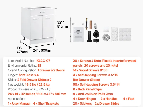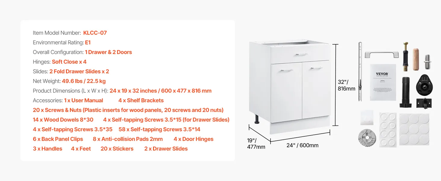 Quality Wood: The ready to assemble cabinet features 24 W x 19 D x 32 H (inch) cabinet size and 44 lbs load capacity. The main structure is crafted from high-quality particle board, while the drawer is made of MDF, ensuring long-lasting durability. All exposed panels are protected by corner protectors and carefully packaged to protect the surface from scratches