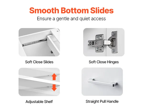 Soft Close Drawer: Equipped with a smooth sliding drawer, each with an internal dimension of 21.46 x 13.19 x 3.95 inch. The drawer opens and closes effortlessly, with soft-close slides that slow down the drawer when closing, reducing noise and shock. With straight pull handles for easy pulling, the white shaker cabinet is ideal for use in living rooms, offices, entryways, and garages