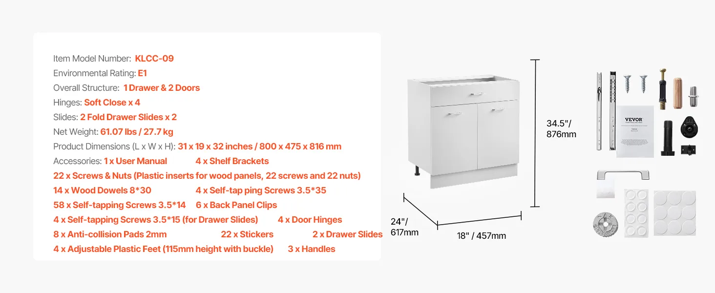 Quality Wood: The ready to assemble cabinet features 31 W x 19 D x 32 H (inch) cabinet size and 44 lbs load capacity. The main structure is crafted from high-quality particle board, while the drawer is made of MDF, ensuring long-lasting durability. All exposed panels are protected by corner protectors and carefully packaged to protect the surface from scratches