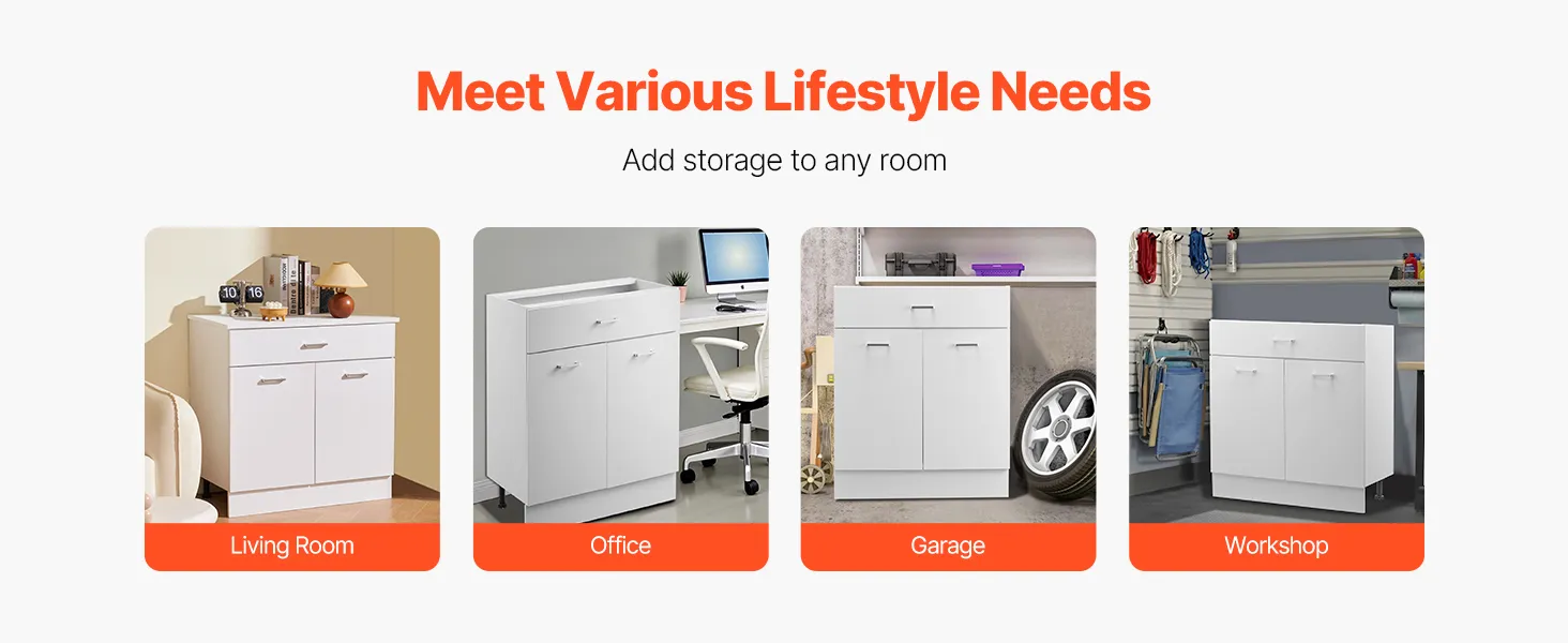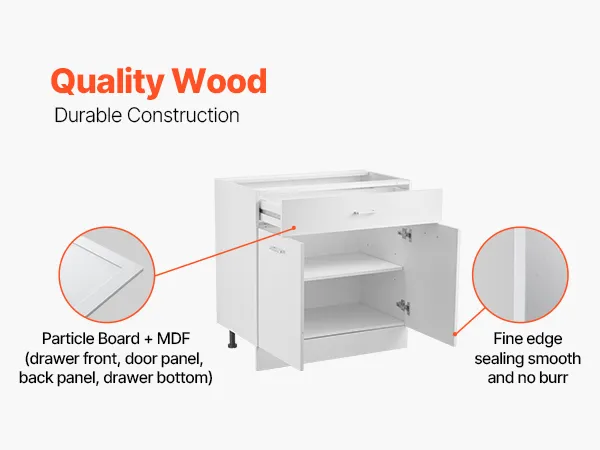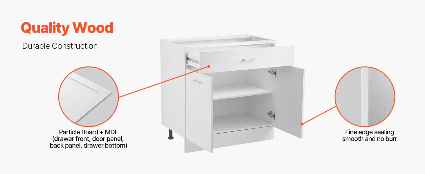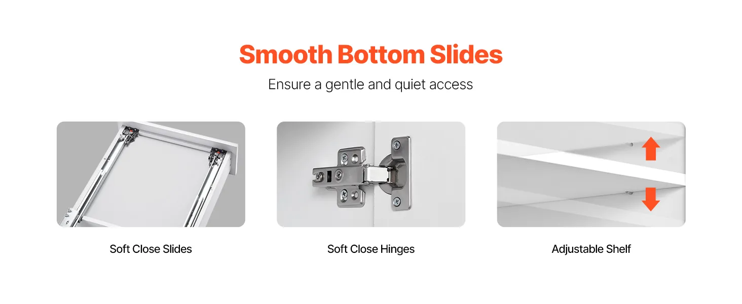 Easy to Clean: The surface features 3M stickers, paired with finely crafted interiors to enhance the overall aesthetics and durability of the storage cabinet. It’s also easy to clean—simply use a soft cloth to maintain the surface. Avoid sharp objects that could scratch and damage the appearance of your base cabinet