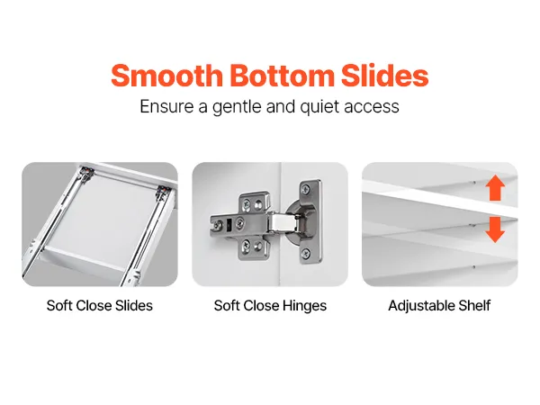 Soft Close Drawer: Equipped with a smooth sliding drawer, each with an internal dimension of 14.57 x 13.19 x 3.95 inch. The drawer opens and closes effortlessly, with soft-close slides that slow down the drawer when closing, reducing noise and shock. With straight pull handles for easy pulling, the white shaker cabinet is ideal for use in living rooms, offices, entryways, and garages