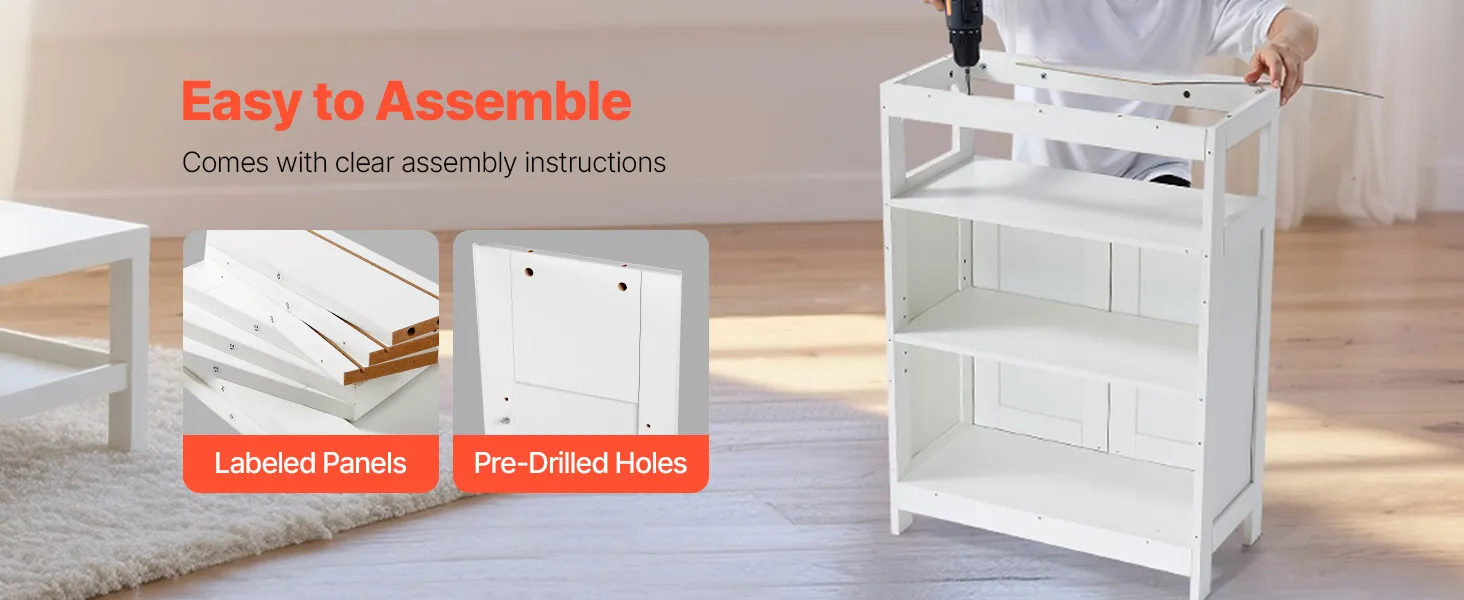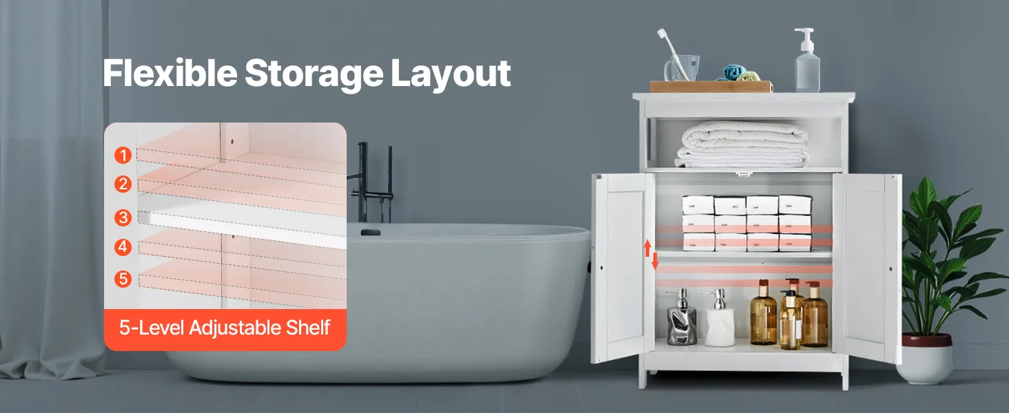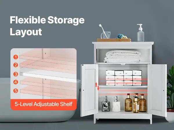 Adjustable Shelf Heights: Equipped with pre-drilled holes, the bathroom floor storage cabinet provides five height levels to customize shelf spacing. It is ideal for storing items of different sizes with ease