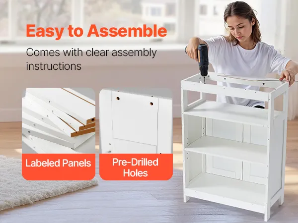 The freestanding bathroom cabinet comes with all the necessary accessories and pre-drilled holes, with each part clearly numbered to make assembly simple and straightforward.