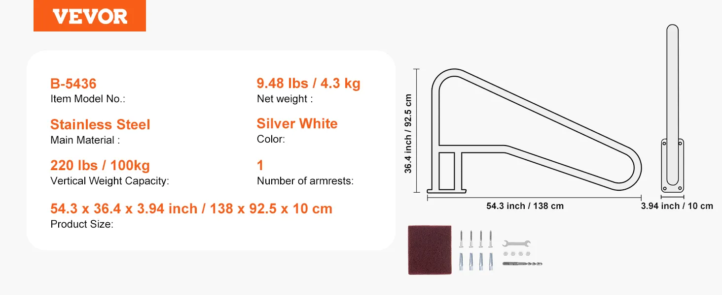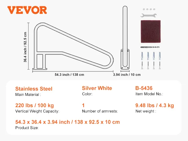 VEVOR Pool Handrail, 54 x 36 inch Pool Railing, Stainless Steel with Base Plate for Indoor/Outdoor Pools,Swimming Pool Safety Railing for Decks,Rust-Proof Grab Bar w/ Grip Cover&Accessories for Spas