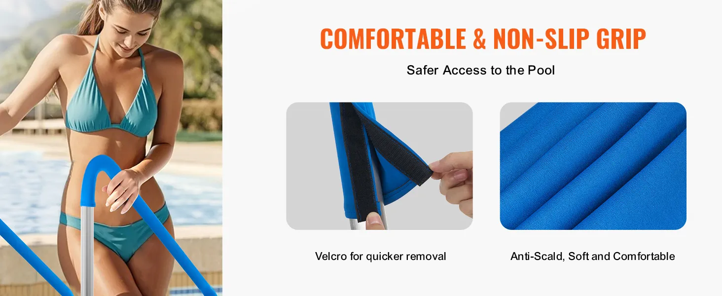 Stable Structure: The unique three-stage bend design allows for a secure grip when boarding, offering safety and ease of use. Soft, comfortable non-slip grips ensure stability while occupying minimal space. Elegant and Functional: This handrail combines durability with an elegant silver-white finish, featuring a refined texture that complements any setting. Whether by an outdoor pool, spa, or water park, it enhances both safety and aesthetics
