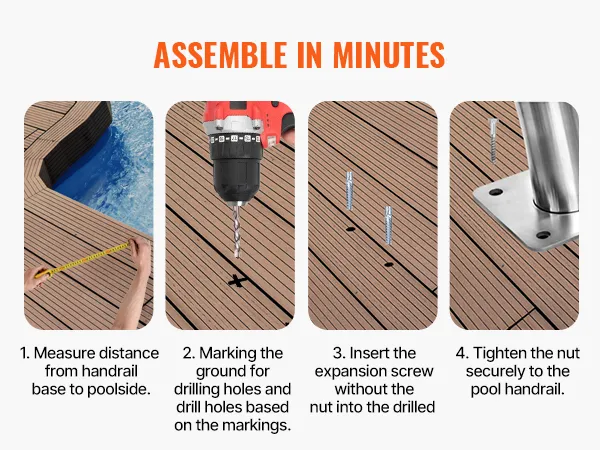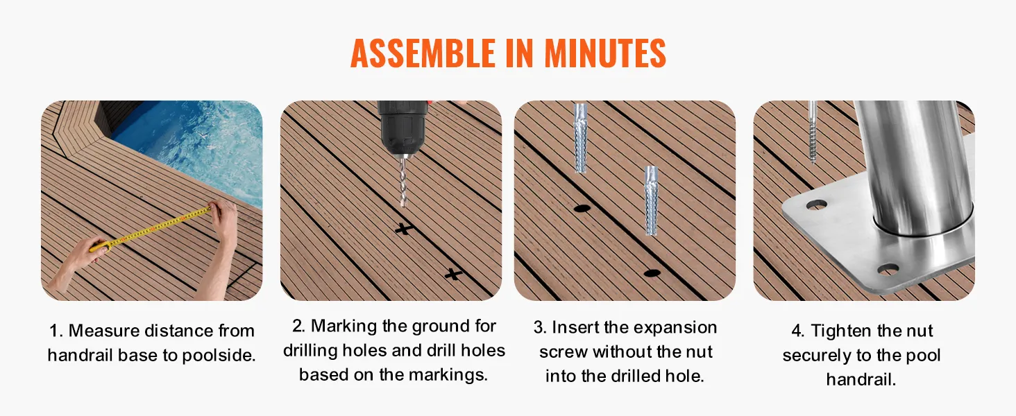 Our pool handrails are compatible with various surface materials, including concrete, wood, and tile, allowing for quick installation. No complicated tools are needed to create a safe and sturdy outdoor handrail.