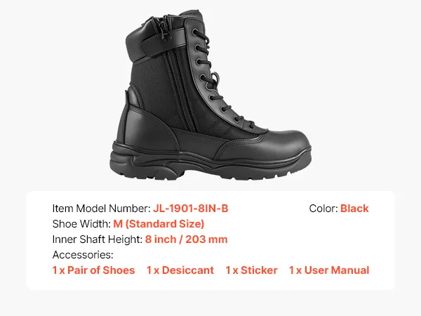 Full Ankle Support: Featuring an 8-inch (203mm) high-top design, these combat boots provide full ankle support and protection. The YKK side zipper ensures easy wear, saving time, while 8 pairs of eyelets with ≥40kgf tension pass SATRA TM149 tests for secure laces