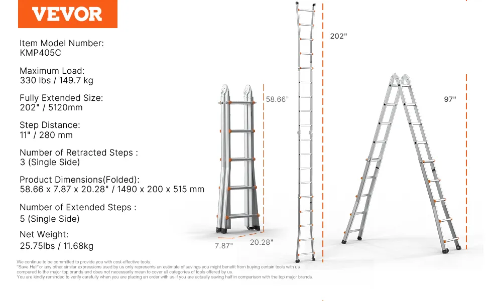 This versatile A-frame extension ladder can be expanded and contracted into multiple configurations to meet various height requirements, making it suitable for different scenarios. Its outwardly angled legs provide enhanced stability and grip, requiring no assembly.