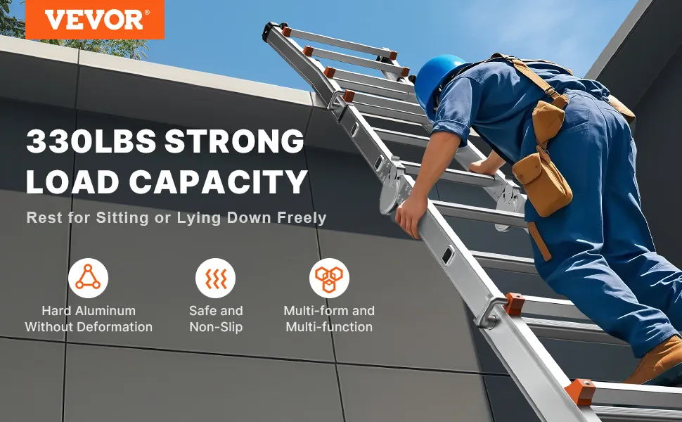 Safe A-Frame Ladder: Designed with an A-frame structure for enhanced stability, this extension ladder supports a weight capacity of up to 330 lbs. It requires no assembly, allowing for immediate use, and its non-slip design ensures peace of mind while working at heights.