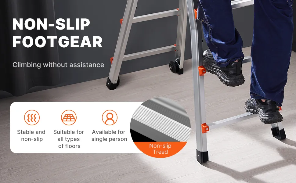 Equipped with non-slip foot caps, this ladder remains stable on various surfaces, providing protection for your flooring while preventing slips, even when used solo.