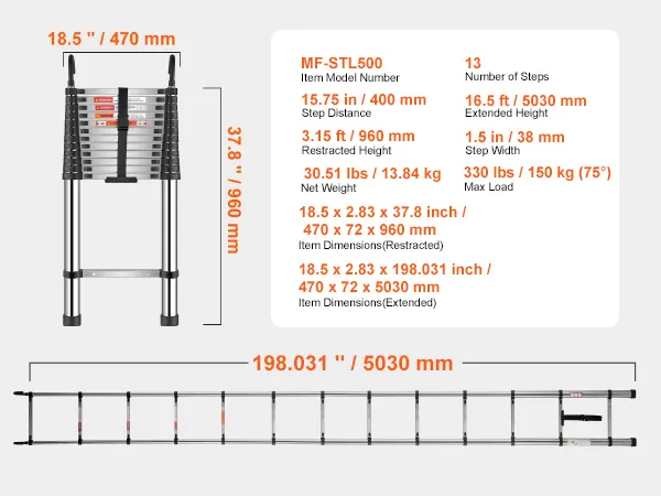 • Versatile Design: This telescopic ladder offers a retractable design that allows for manual height adjustment. When fully extended, it reaches 16.5 ft, and when contracted, it is just 3.15 ft in height