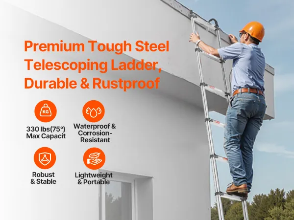 • Sturdy and Durable: Our telescoping ladder is made from tough steel and reinforced with nylon connectors for added strength and durability, supporting up to 330 lbs / 150 kg(75°). It meets the needs of both home and commercial use, and comes with 2 additional hooks for extra stability, giving you peace of mind while working at heights. Friendly Note: 1. Use the ladder at a 75-degree angle; weight capacity decreases as the angle lowers. 2. Do not climb the ladder quickly; always ensure safety while using it