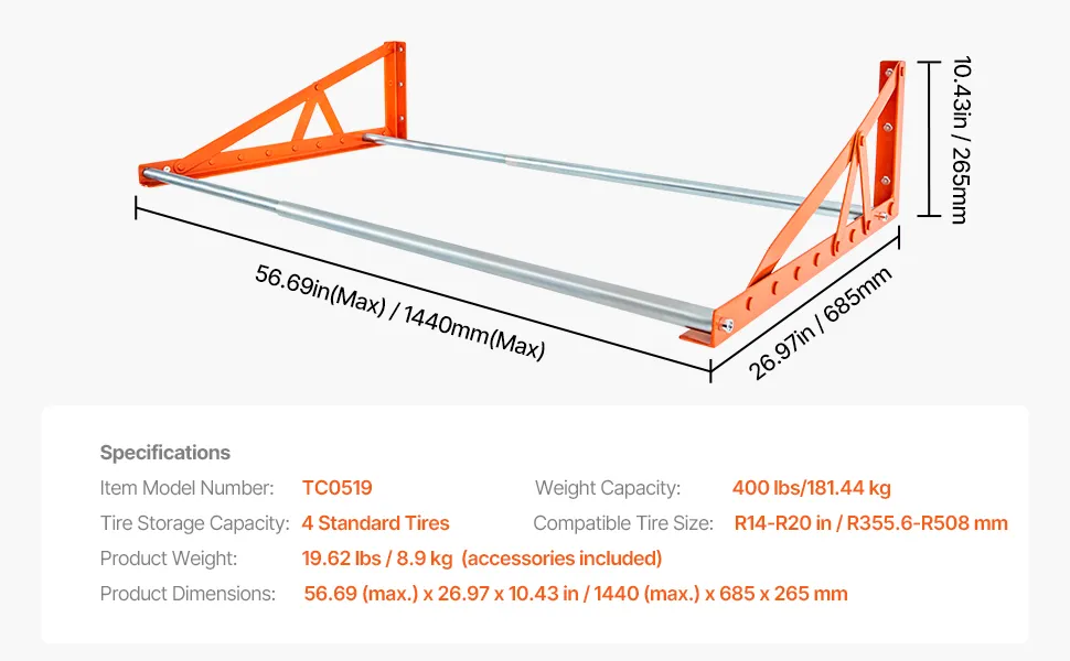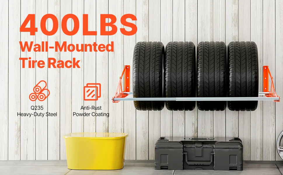 This heavy-duty wall-mounted tire rack is crafted from durable Q235 steel with rust-resistant powder coating, supporting up to 400 lbs. 31" - 56" adjustable length allows to store up to 4 standard tires off the ground, optimizing space and keeping your garage organized and clutter-free.
