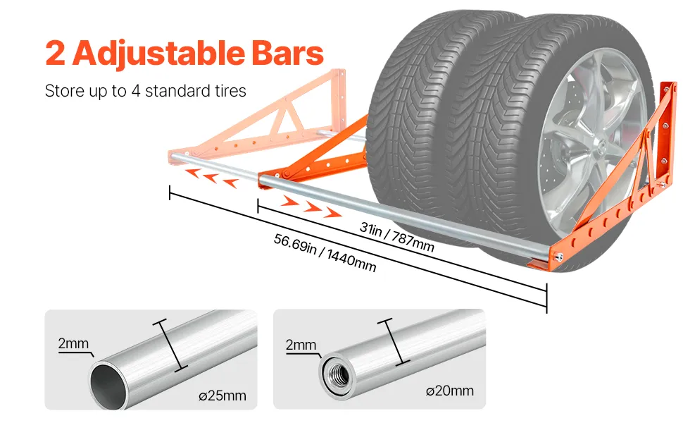 Featuring extendable support bars adjustable from 31 to 56 inches, this tire storage rack can hold up to 4 standard tires off the ground. Compatible with R14-R20 inch tires, it offers a flexible storage solution for your garage or workshop.
