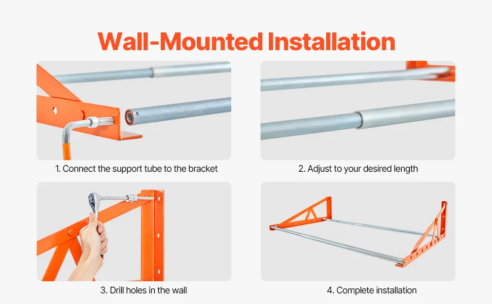 This wall-mounted tire rack is simple to install. Just choose your desired location and width, drill holes in the corresponding spots on the wall, and secure it with the provided screws. You can adjust length and relocate the rack as needed for a custom fit.