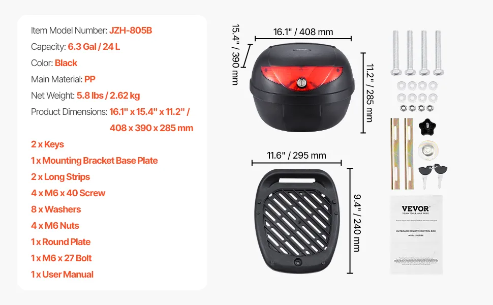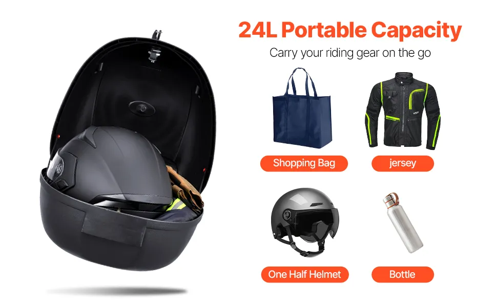 24L Large Capacity: With a 24L capacity, this motorcycle tailbox can hold a half helmet (or smaller full-face helmet), gloves, umbrella, and rain gear, making it ideal for commuting or short trips. It features a robust zinc alloy security lock to avoid theft.