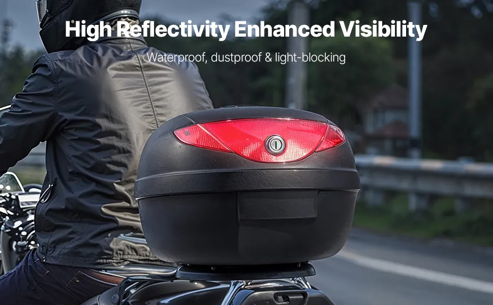 The motorcycle top case’s reflective plates ensure you stay visible to other drivers, keeping you secure on the road, especially at night.
