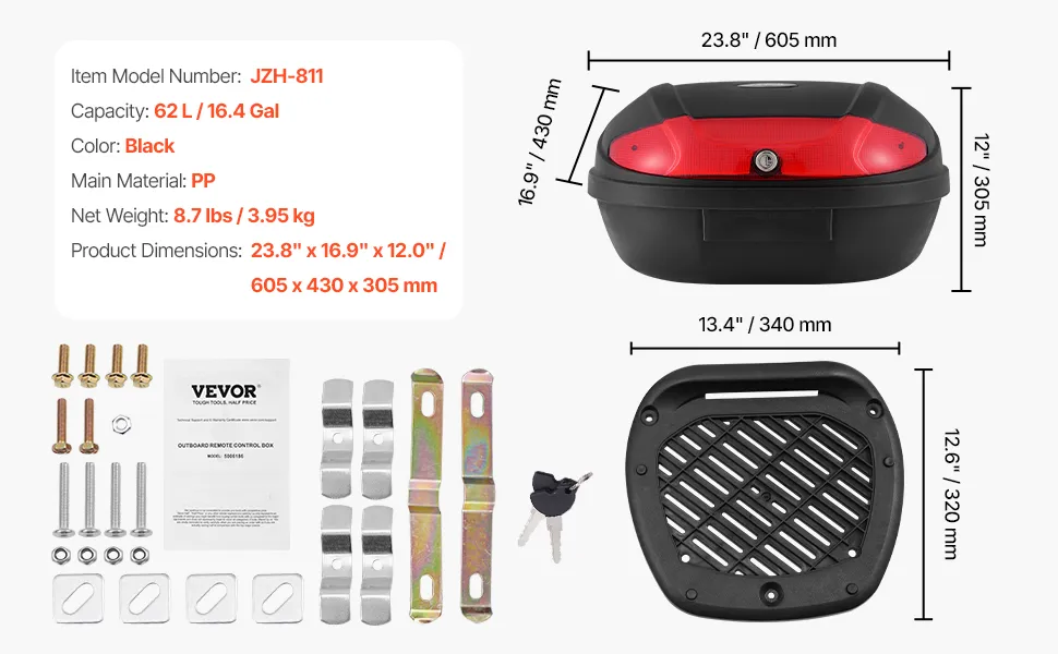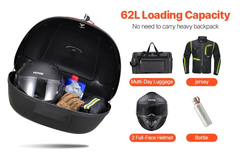 62L Extra-Large Capacity: With a generous 62L capacity, this tailbox fits two full helmets, a large motorcycle jacket, multi-day trip luggage (including shoes and clothes), gloves, umbrella, and rain gear. Ideal for longer journeys, it comes with a strong zinc alloy security lock to ensure your belongings stay secure.