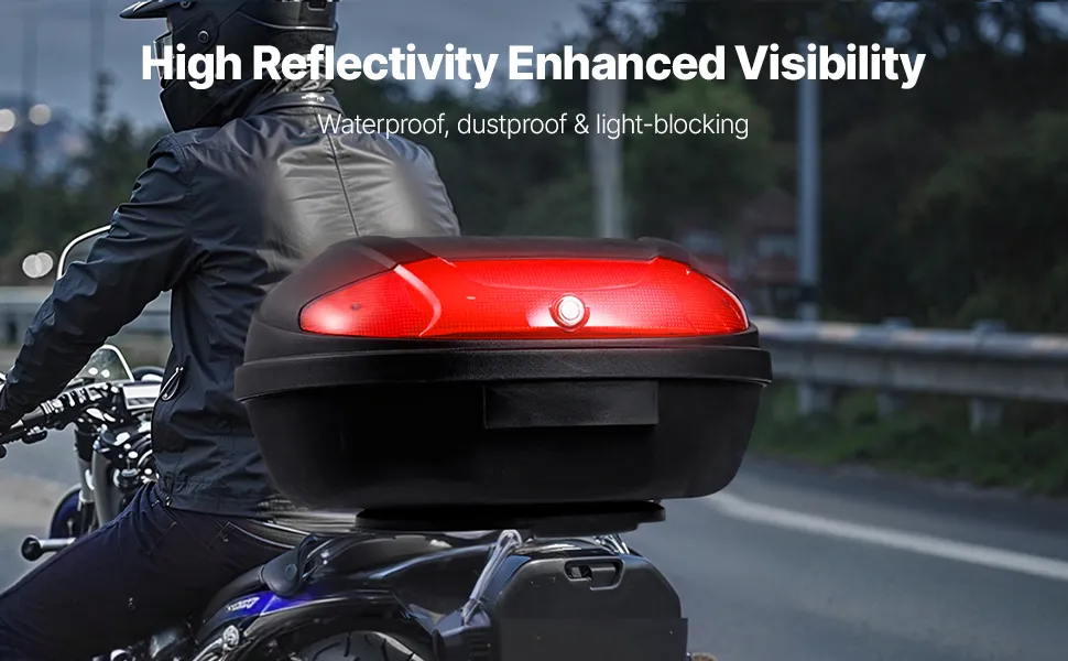 The motorcycle top case’s reflective plates ensure you stay visible to other drivers, keeping you secure on the road, especially at night.