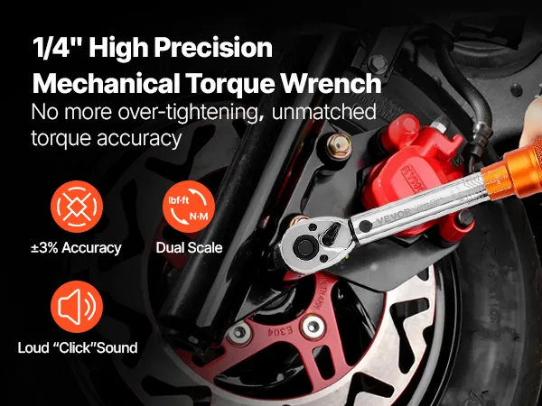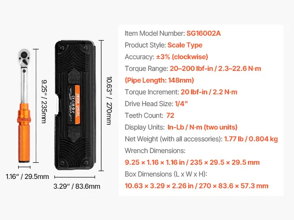 VEVOR Click Torque Wrench Set, 1/4Inch Drive, 20-200lbf-in/2.3-22.6N.m, Dual-direction and Dual Range Scales, 72-Tooth, ±3% High Precision, with Bit Sockets, Extension Bar, for Bicycle Repair, Orange