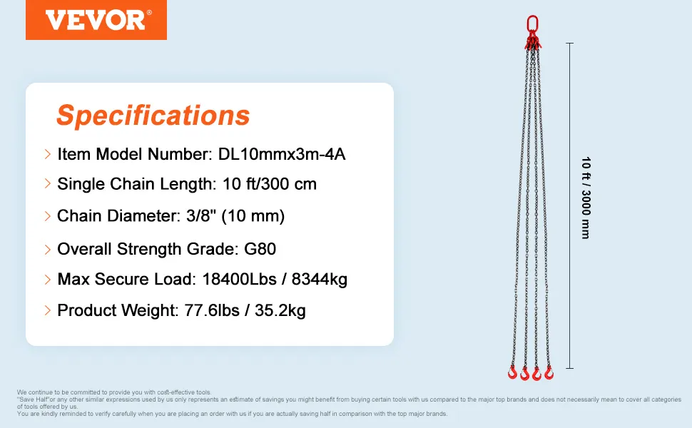 VEVOR, your exclusive tool expert. This chain sling is made of high-quality steel. It also has hooks with spring tongues to better grip and secure large cargo.