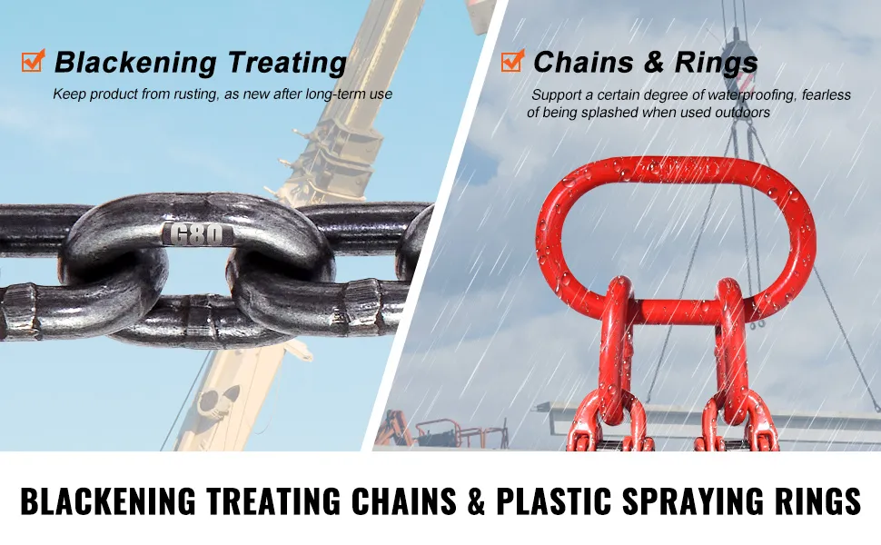 The lifting sling chains adopt a blackening treatment, and the rings/hooks adopt a plastic spraying treatment. They are beautiful and rustproof, as good as new after long-term use.