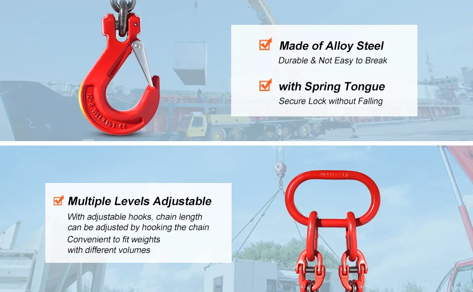 With Four Adjusters: Our sling chains are equipped with four adjusters, you can adjust the length of the chain through the adjusters. So that it will be safer and more stable when lifting irregular objects.