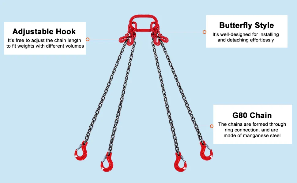 Heavy Duty Chain & Hooks: Constructed of G80 Mn-steel chain and alloy steel hook, our chain sling features full-automatic welding technology, designed for long-term use.