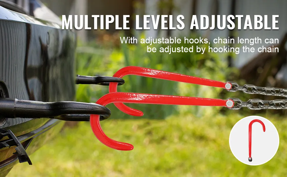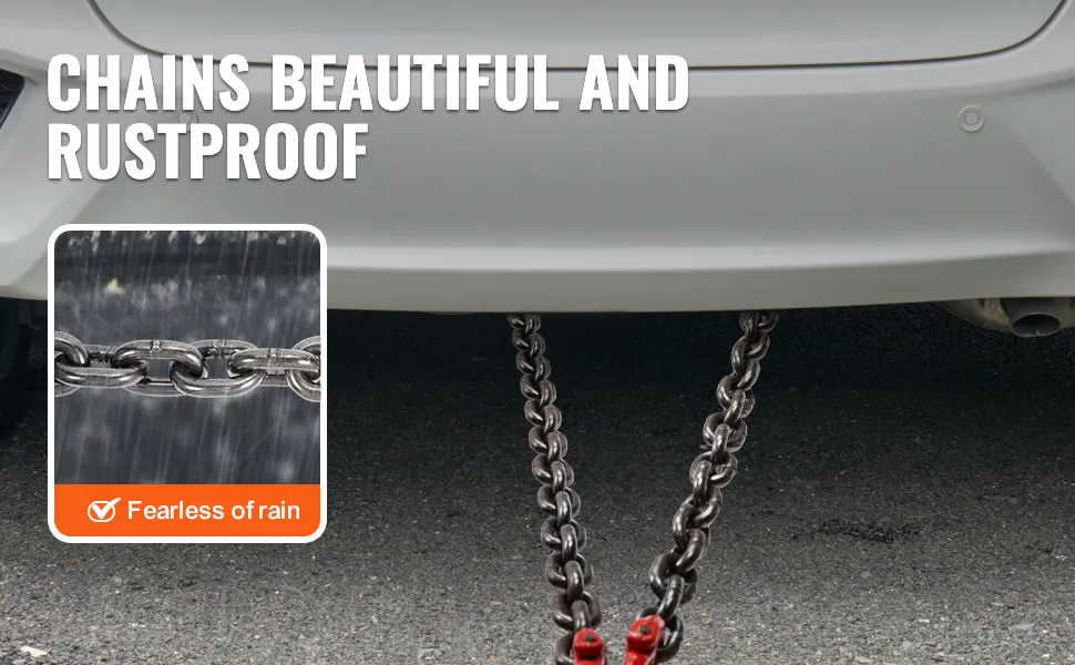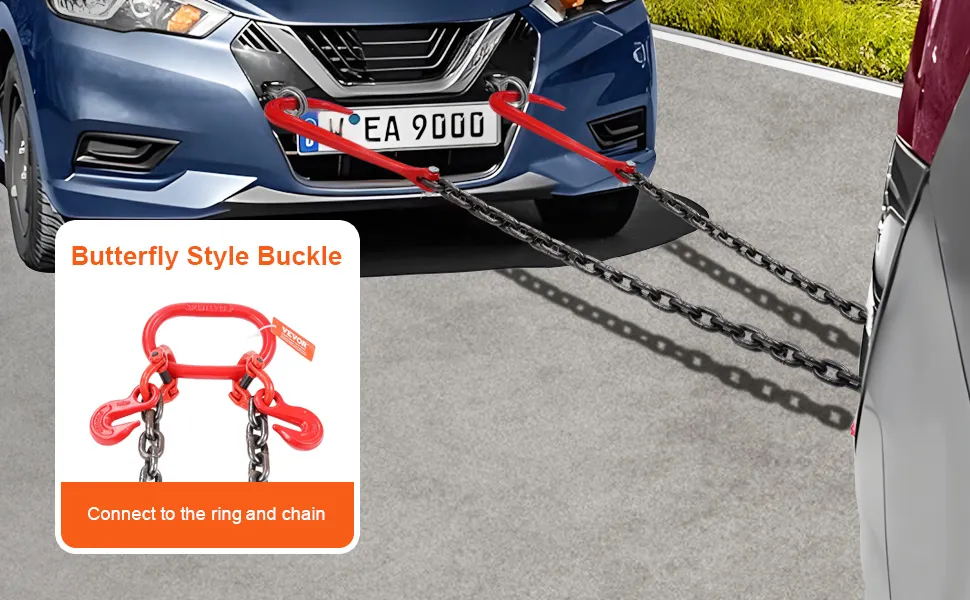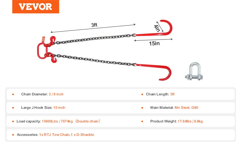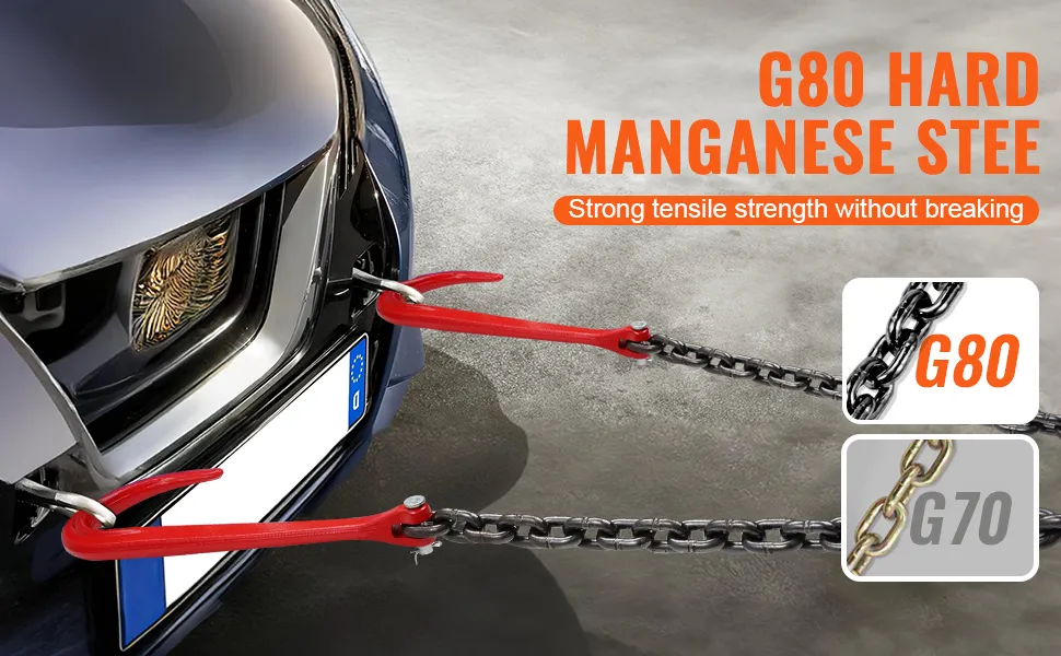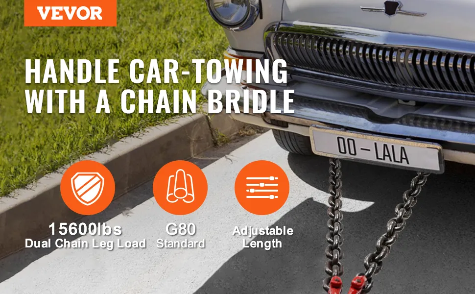 VEVOR, your exclusive tool expert. This V bridle chain is made of high-quality steel with Grade 80 overall strength. It is also equipped with hooks to fit various types of vehicles.