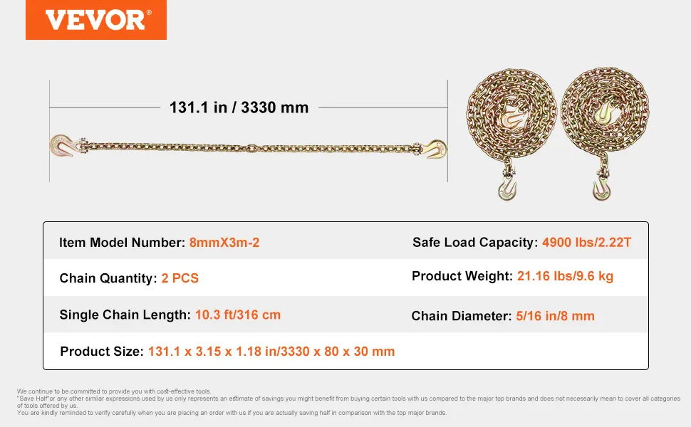 4900 lbs/2.22T Strong Load Capacity: Our tow chain can handle a working load of 4900 lbs (2.22T). With a 4:1 security factor, it means you're covered for loads up to four times that amount. Feel secure and confident with every use.