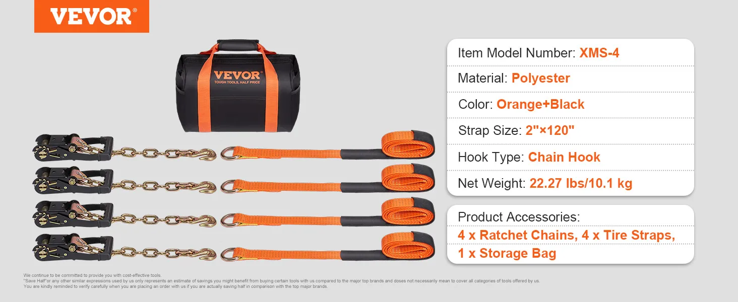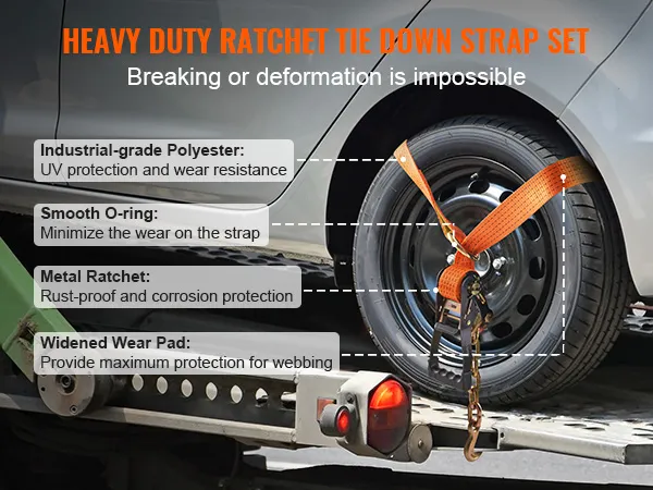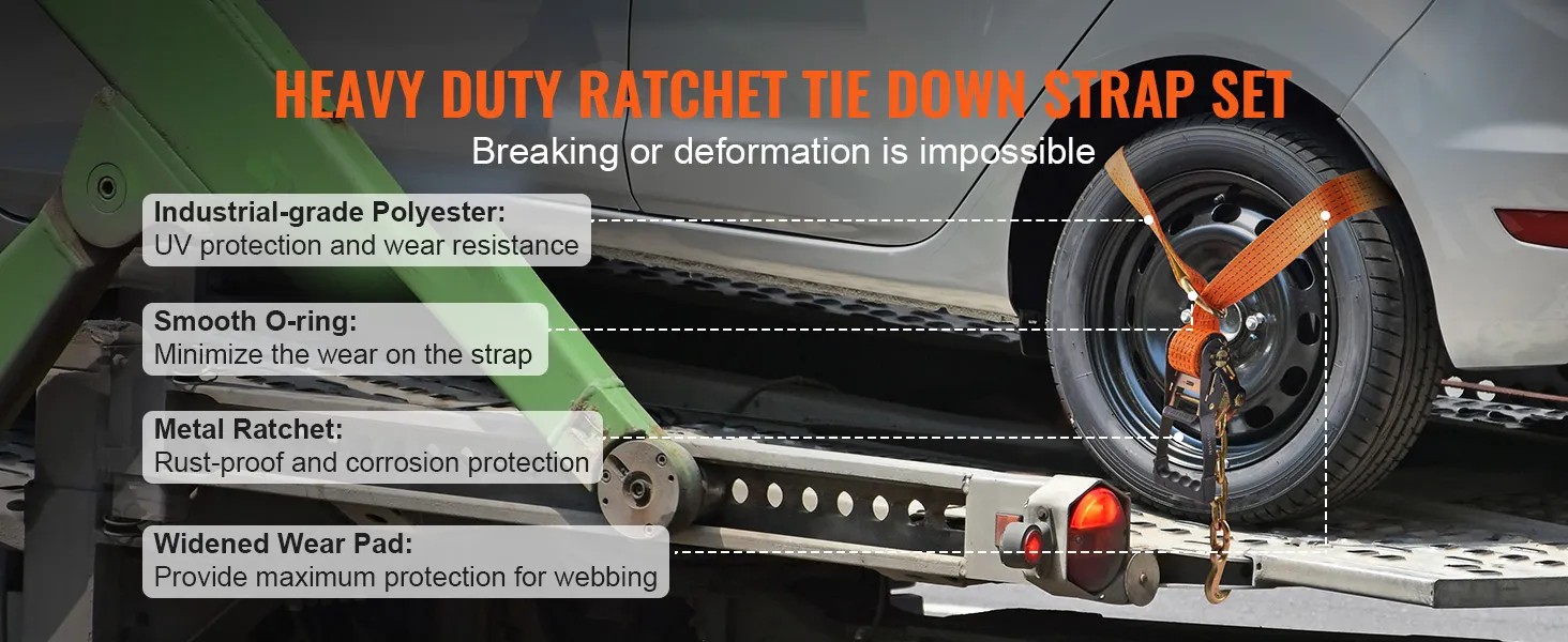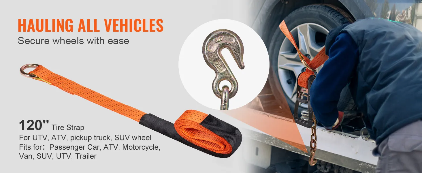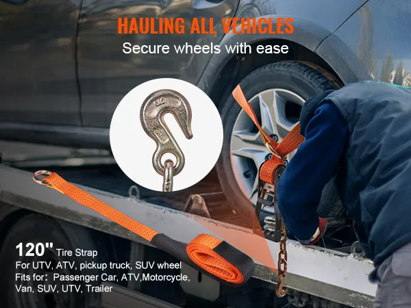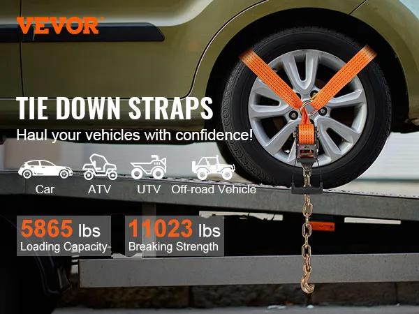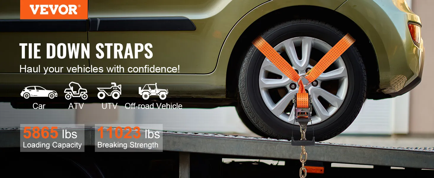 The VEVOR tie down straps are designed with versatility in mind. They are perfect for securing cars, ATVs, SUVs, UTVs, and trucks. The lasso-style straps provide a secure hold over the tires or through the wheels. This ensures your vehicle stays firmly in place during transport. Easy to install, these straps make putting your cargo securely in position quick and hassle-free. Heavy-duty ratchets add an extra layer of security. These features make the VEVOR's strap systems a dependable choice for any type of vehicle. Peace of mind: With these versatile straps, you can feel peaceful knowing your car is safe and secure.