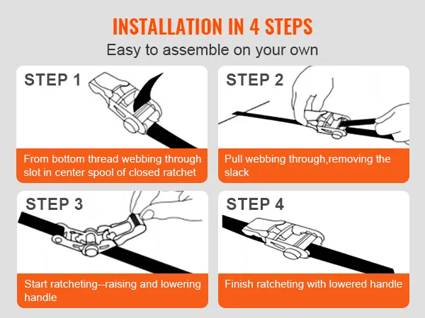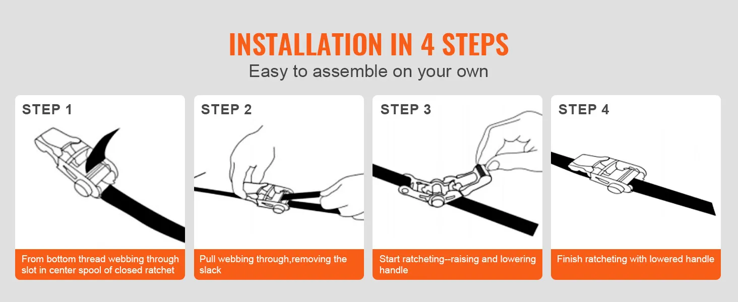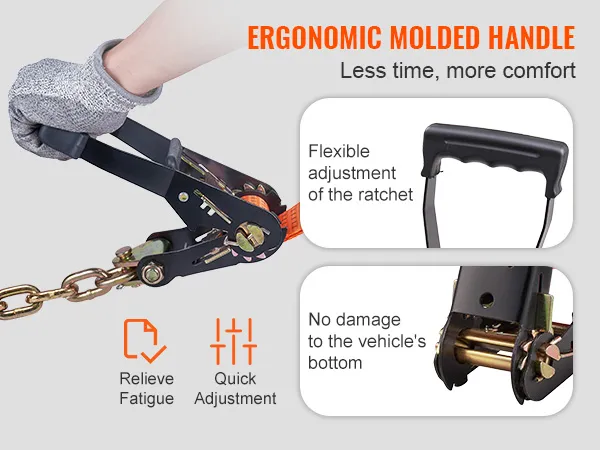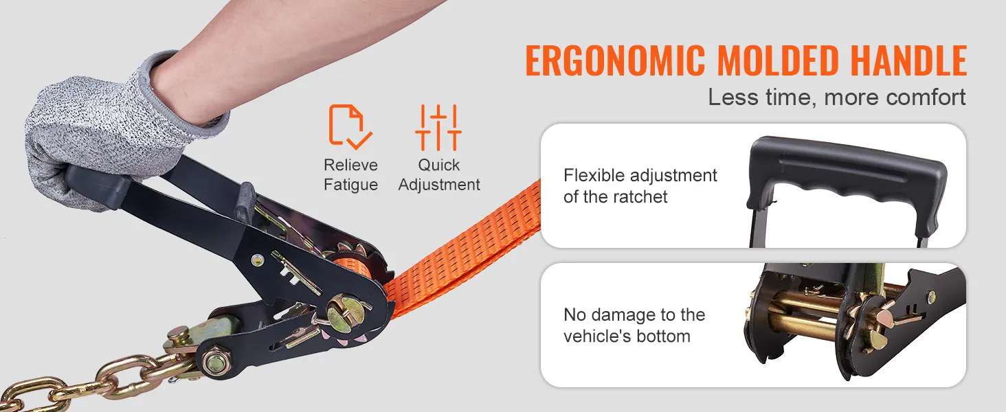 These straps feature heavy-duty ratchets designed for durability. They offer strong tensioning that keeps your cargo secure. The ratcheting system is smooth to operate. This makes the strapping process quick and easy. Even with repeated use, the ratchets remain reliable. These notch systems are designed to handle heavy loads without fail. Our robust ratchets ensure that the straps maintain their tension throughout the journey. It guarantees that your goods stay stable and secure, trusting the VEVOR ratchet straps for their strength and reliability.