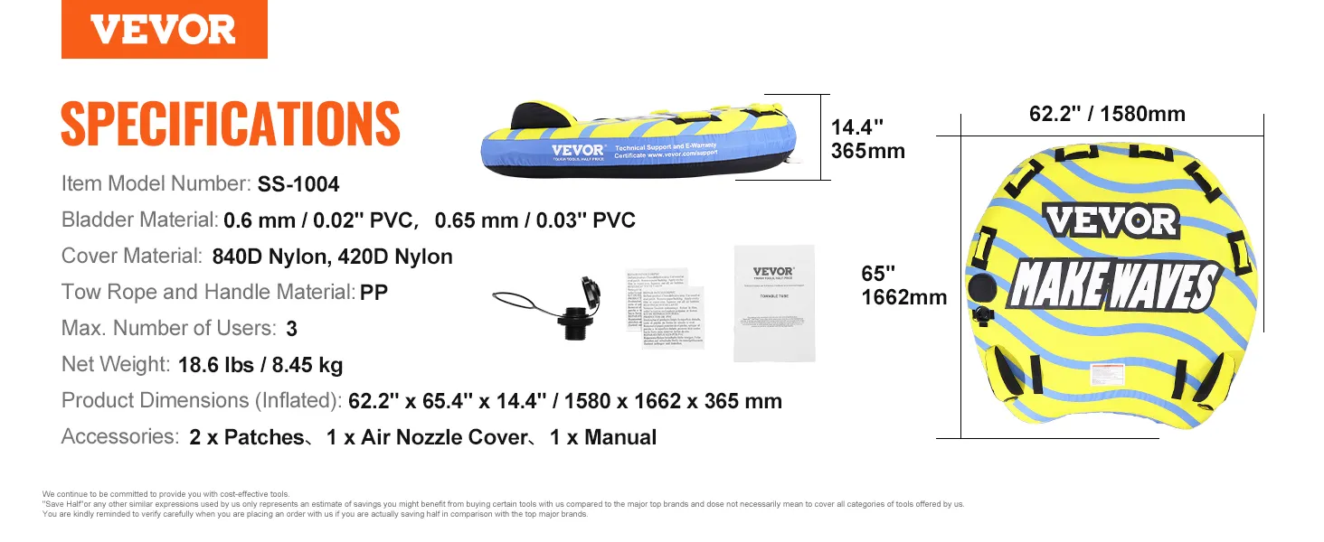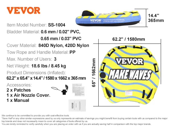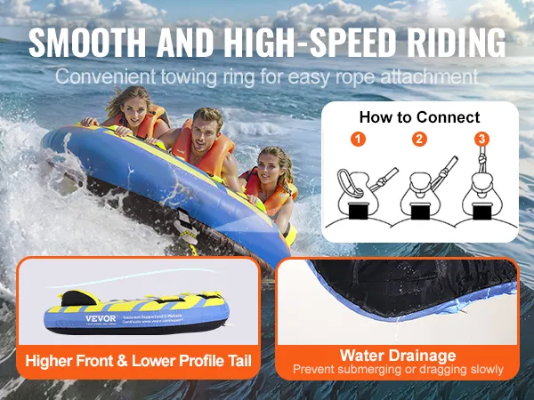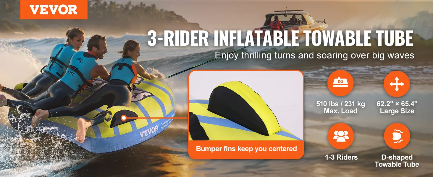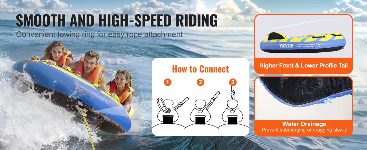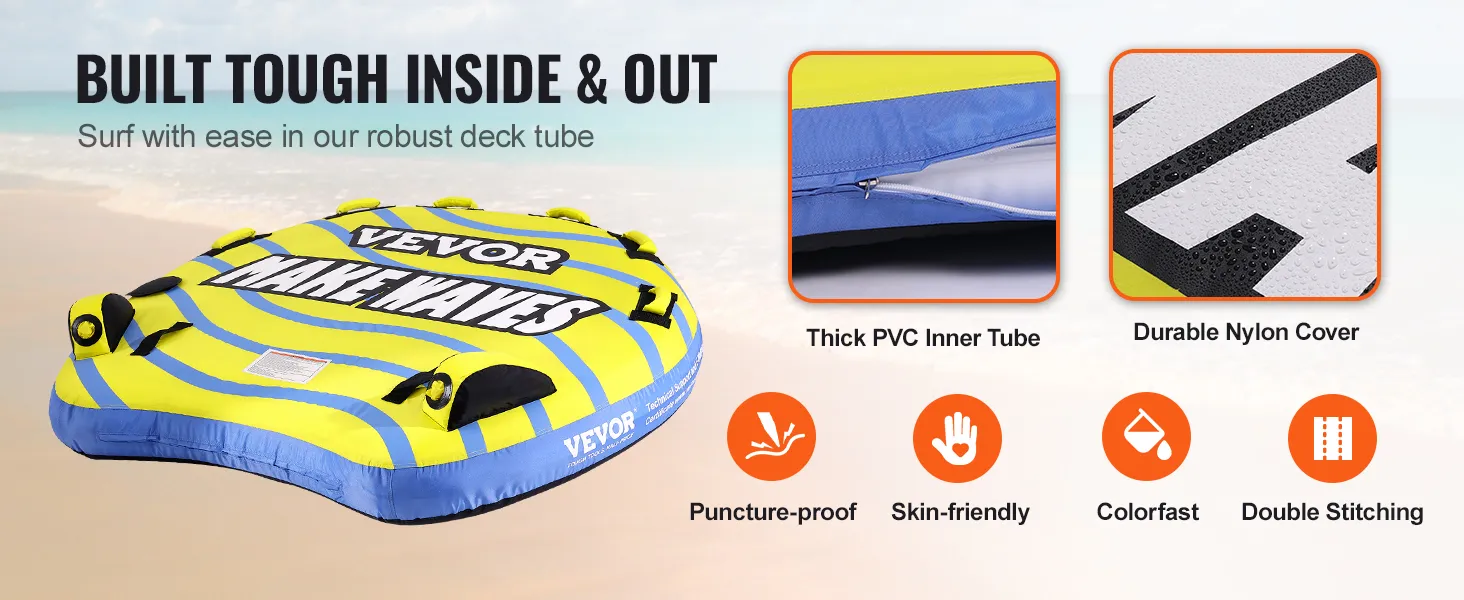 The VEVOR towable tube for boating is a perfect choice for family fun. It is designed to last and is made from high-quality materials. This tube can handle up to three riders. You get a smooth ride with plenty of room. The tube is easy to inflate and deflate. It features sturdy handles that provide a 'sure grip.' The bright colors and stylish design make it appealing. Enjoy your time at the lake all year round with this reliable tube. The makers promise durability and fun for all ages too.