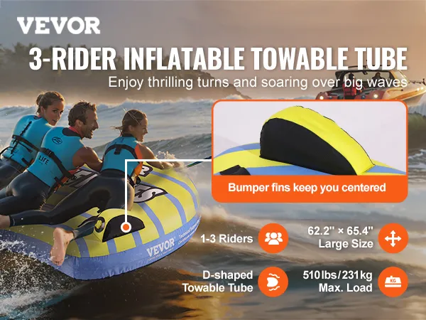 VEVOR Towable Tube for Boating, 1-3 Riders Inflatable Towable Tube with Bumper Fins, 510 lbs Water Sport Towable Tubes for Boats to Pull, Full Nylon Cover, EVA Grab Handles and Speed Safety Valve