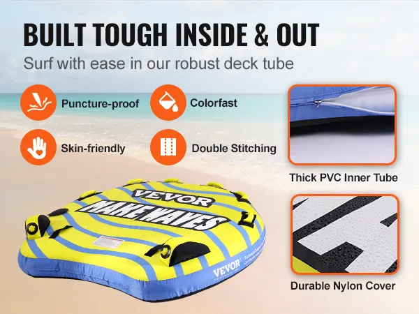 The VEVOR towable tube for boating is made from high-quality materials. It features a strong PVC bladder and a slick nylon cover. This ensures the tube lasts for many seasons. The materials are resistant to wear and tear. They can handle rough water and high speeds. The tube is built to withstand heavy use. These high-quality materials add to the overall value of the product. This tube offers excellent performance and longevity. The material used is top-notch, ensuring excellent performance every time. A durable and high-performing product will last.