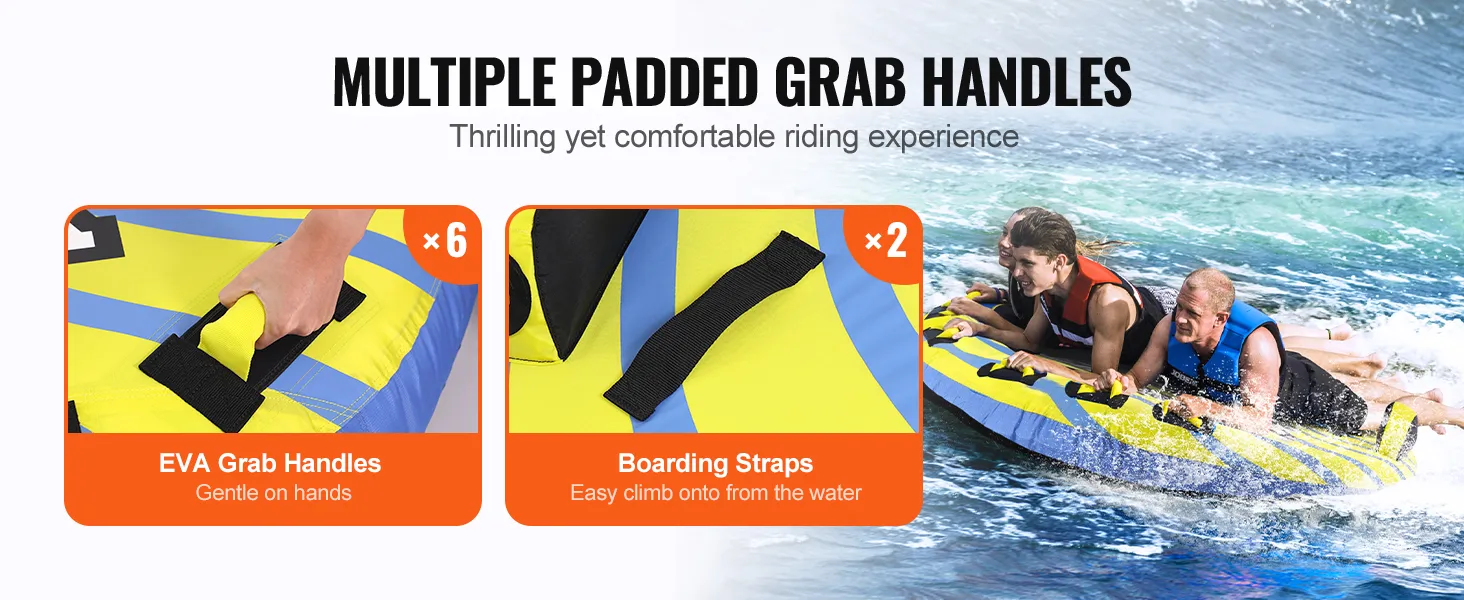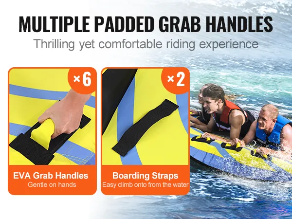 Comfortable Riding Experience: Experience a secure ride with our towable tube for boating. The towable tube features 6 EVA grips for comfortable hand-holding, along with 2 boarding straps for easy re-entry onto the tube after a splash.